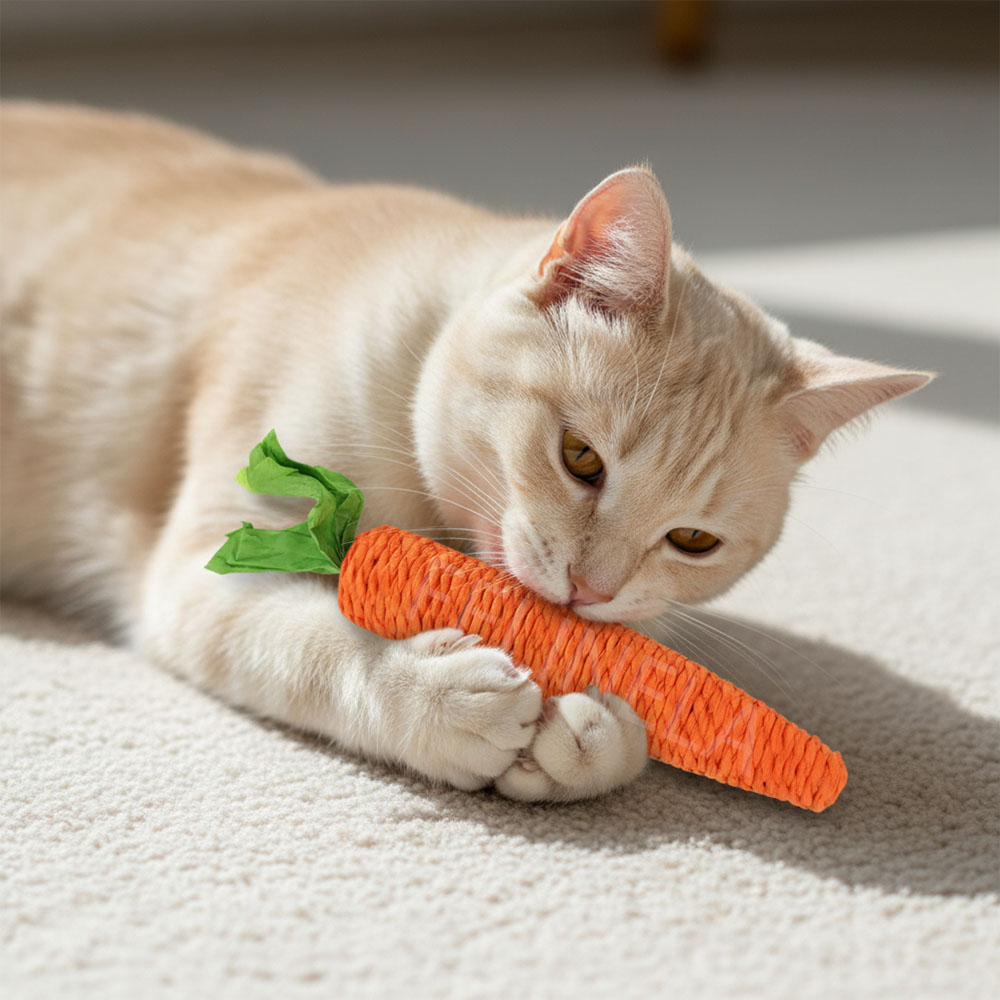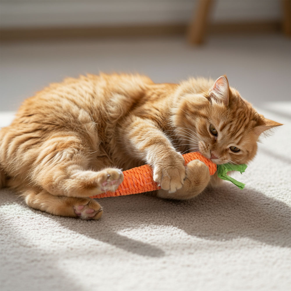 Știi momentul când pisica prinde ceva între lăbuțe, se întinde pe o parte și începe să lovească cu cele din spate? E un comportament tipic de vânătoare, iar Morcovul Zornăitor pentru pisici se potrivește foarte bine pentru asta. Este ușor, poate fi aruncat și prins fără efort, poate fi apucat și ros timp îndelungat, iar forma alungită îl face ușor de ținut între lăbuțe. Hârtia răsucită oferă rezistență sub dinți și gheare, exact ce caută multe pisici în timpul jocului.