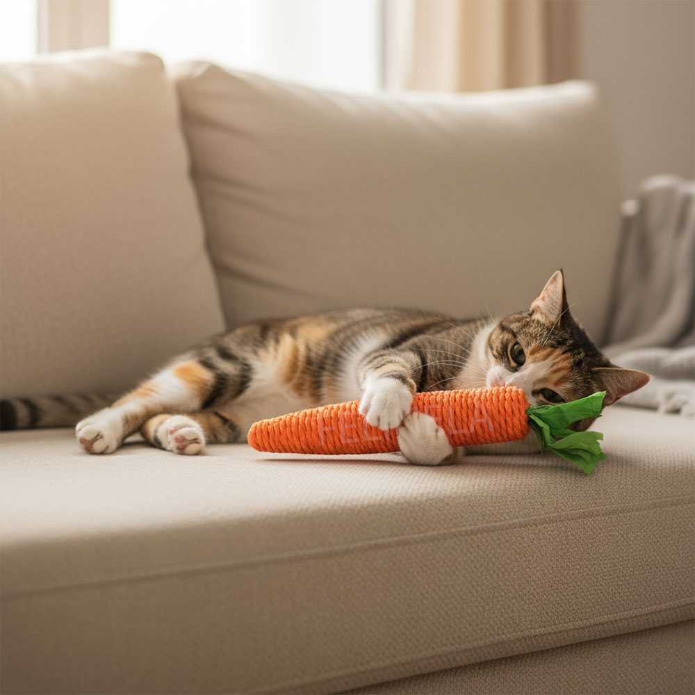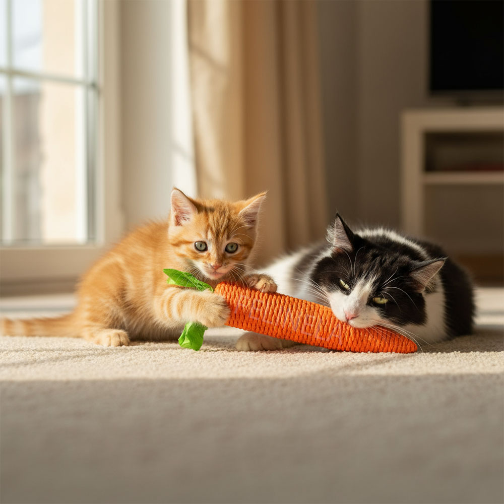 Unele jucării sunt potrivite doar pentru pisici tinere, altele doar pentru cele mai liniștite – acest morcov este cu adevărat versatil. Puii sar pe el imediat ca pe o pradă, învățând instinctul de vânător, consumând energie și exersând coordonarea. Pisicile mai în vârstă, care nu mai au aceeași forță, apreciază greutatea redusă – îl pot prinde ușor în gură, muta în alt loc sau rostogoli fără efort mare. Se potrivește în etape diferite ale vieții, ceea ce îl face o alegere practică pe termen lung.
