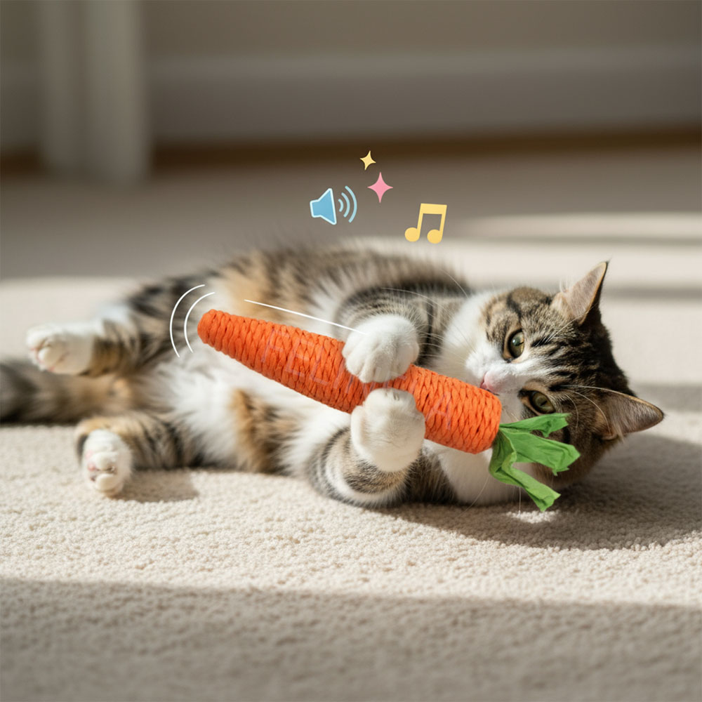Pisicile reacționează rapid la sunete – un simplu foșnet e suficient să le capteze atenția. Morcovul Zornăitor pentru pisici are în interior o zornăitoare, iar în plus „frunze” foșnitoare, astfel încât fiecare mișcare produce un sunet diferit. Combinația multisenzorială de textură și zgomot face obiectul mai atractiv pentru multe pisici, fără stimulare suplimentară.