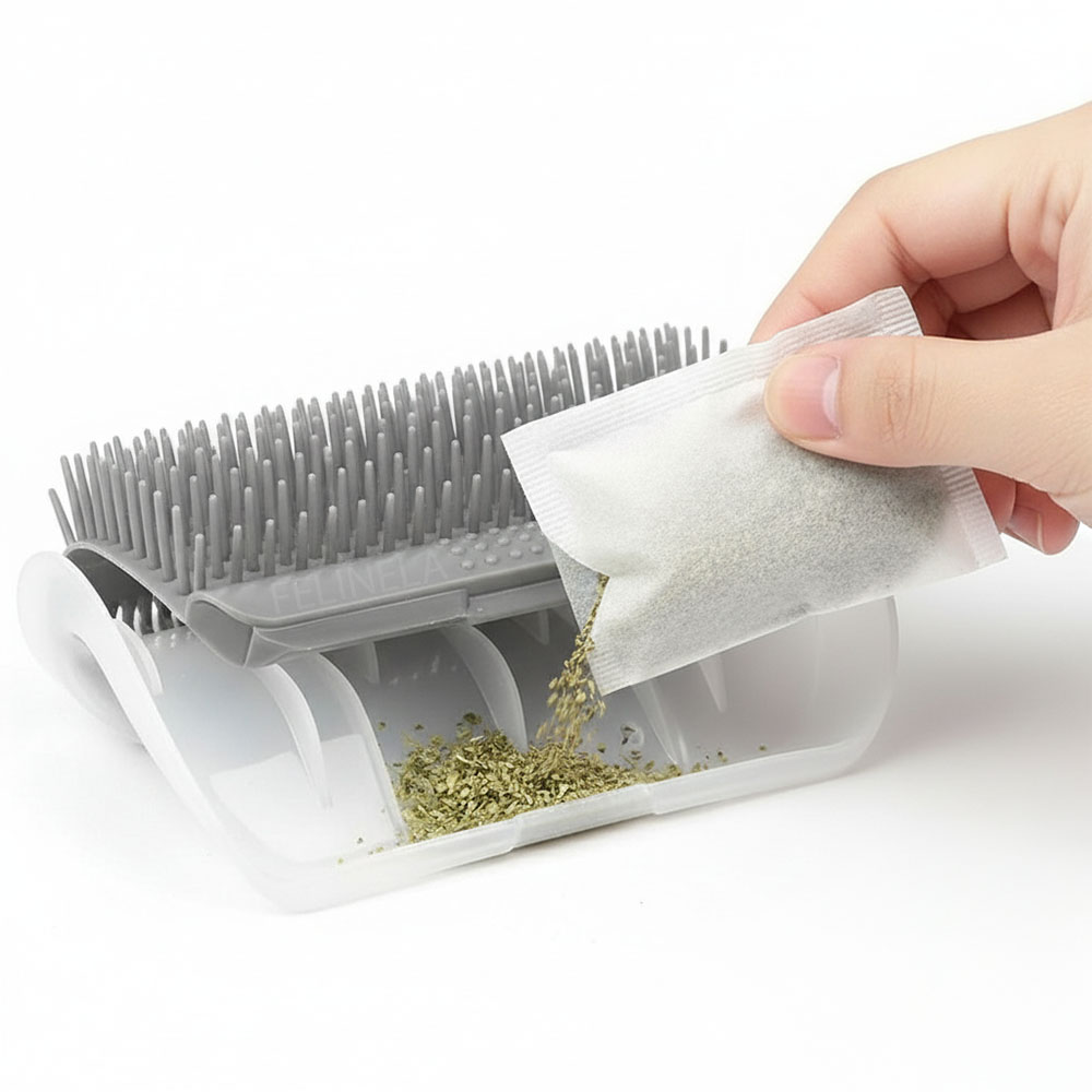 👉 Compartiment integrat pentru catnip, care o atrage mai ușor la perie.